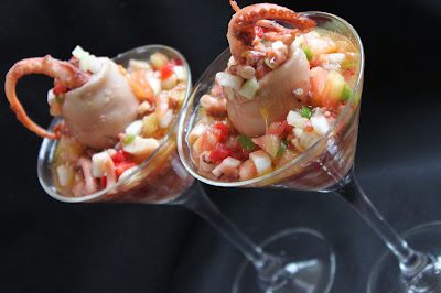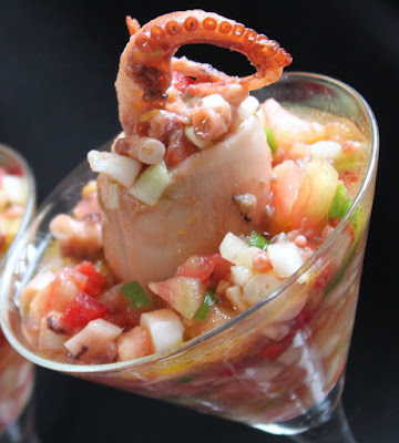 Como veis, lo presento algo diferente a como es habitual rellenando las capuchas con la mezcla y un tentáculo para decorar. Sirvo la pipirrana de pulpo en copas de coctel y sobre ésta, una capucha rellena.